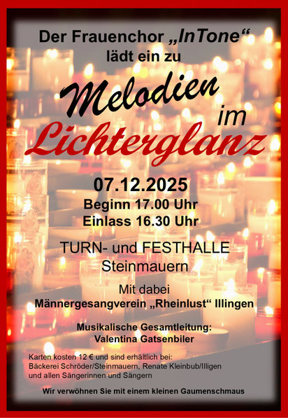 Wir, der Frauenchor InTone, suchen jederzeit noch Frauen die Lust haben, uns mit ihrer Stimme und Freude an der Musik zu unterstützen. Bei uns muss man nicht "vorsingen" - man darf einfach vorbei kommen. Wir treffen uns immer donnerstags, 19.30 Uhr im Bürgerhaus Steinmauern, Hauptstraße 75, 3. OG.